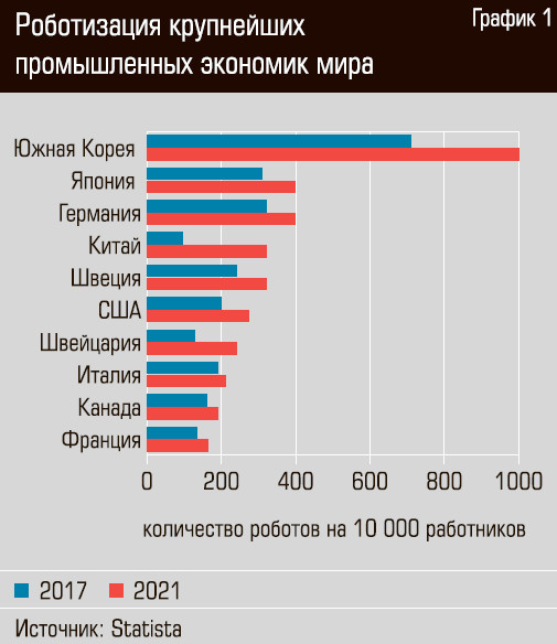Втиши монотонного развития мировой экономики происходит очередная промышленная революция. Развитые страны Азии и Европы массово внедряют роботизированные производства. Впереди планетарного процесса роботизации — Южная Корея: здесь уже работает один робот на десять рабочих. Следом идут Япония и Германия: один робот на 25 синих воротничков. В затылок им дышит Китай: один робот на 33 работника. Некогда индустриально развитые страны — США, Италия, Франция — замыкают десятку лидеров в гонке автоматизации производств.