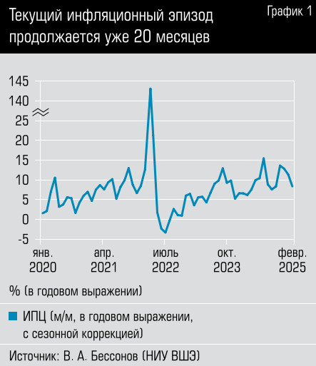 Как рассказал «Моноклю» Владимир Бессонов, инфляционный эпизод, в котором мы находимся сейчас, начался в середине 2023 года и продолжается уже 20 месяцев. На протяжении этого времени индекс потребительских цен (ИПЦ) с поправкой на сезонность увеличивался в среднем на 0,76% в месяц, что соответствует годовым темпам в 9,53%, что почти в два с половиной раза превышает цель ЦБ по инфляции. «Эти темпы не отличаются постоянством: они то значительно ускоряются, то заметно замедляются. Такая волатильность характерна для периодов высокой инфляции», — добавляет эксперт.