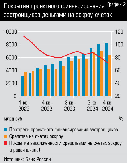 Это очень важный момент: от покрытия счетами эскроу зависит ставка, по которой компаниям предоставляется проектное финансирование. Говоря проще, та часть, которая не покрыта счетами эскроу, выдается на рыночных условиях. За четвертый квартал 2024 года средневзвешенная ставка по портфелю проектного финансирования игроков рынка недвижимости выросла на 1,6 п. п., достигнув 9,4%. Впрочем, это все еще вдвое ниже средней ставки по корпоративному портфелю банков в целом (18,7%, +1,9 п. п. за четвертый квартал).
