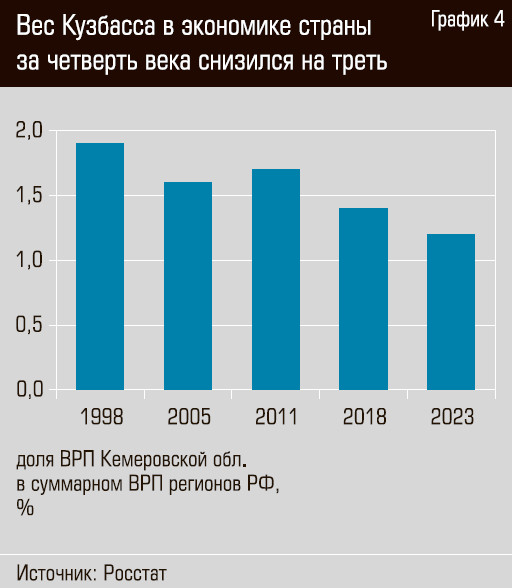 Однако явное доминирование сырьевой отрасли не пошло на пользу экономике региона и не обеспечило благополучие его жителей. Валовой региональный продукт на душу населения в Кемеровской области в 2023 году превысил реальный уровень 2010 года только на 6,1%, тогда как ВРП Сибирского федерального округа вырос за этот период почти на 28%, а ВРП всех субъектов федерации — на 29% (см. график 3). Вес Кузбасса в экономике страны за последние четверть века съежился на треть — с 1,9% в 1998 году до 1,2% в 2023-м (см. график 4). В прошлом году доходы бюджета Кузбасса сократились на 8,5% из-за ситуации в угольной промышленности, дефицит региональной казны вырос до 28,6%.