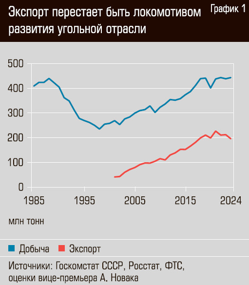 Два десятилетия локомотивом развития нашей угольной отрасли был экспорт. Поставки на внутренний рынок стагнировали, а почти весь прирост добычи отправлялся за рубеж. Экспорт угля из России с начала века до пика в 2021 году вырос в пять с половиной раз, страна прочно обосновалась на третьем месте крупнейших мировых экспортеров угля (после Индонезии и Австралии), что позволило довести объемы добычи твердого ископаемого до позднесоветского максимума (см. график 1). Однако последние три года экспорт сокращается: недружественные государства отказались от российских поставок, другие покупатели, опасающиеся стать объектом вторичных санкций, требуют снижения цен. А в прошлом году заметно просел спрос со стороны крупнейших потребителей угля, Китая и Индии: оба государства делают ставку на приоритетное развитие собственной угледобычи, а первый вдобавок демонстрирует торможение экономического роста. Дополнительно осложняют ситуацию логистические проблемы — не весь потенциально готовый к экспорту уголь удается вывести, сохраняется дефицит провозных мощностей Восточного полигона железных дорог по направлению к дальневосточным портам. В правительстве предсказывают снижение добычи угля до 440 млн тонн к 2025 году, что на 3,5 млн тонн меньше показателя 2024-го.