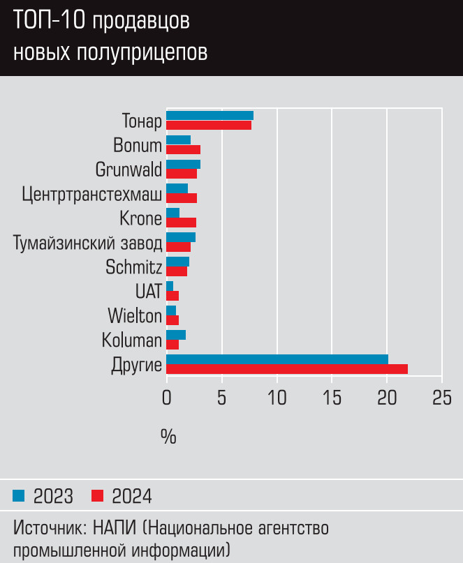 Лидерство сохранили отечественные производители прицепной техники «То нар», Bonum и Grunwald, на которые при шлось более 28% объема продаж.