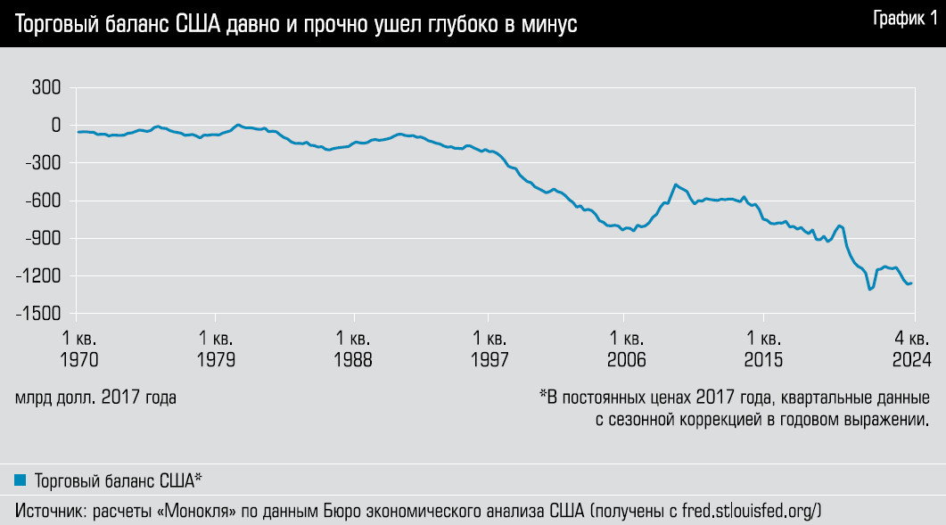 Причина беспокоиться у него действительно есть. Дефицит торгового баланса США в 2024 году составил 1,2 трлн долларов. Причем, даже если учесть не только товары, но и услуги, по которым баланс в пользу США, все еще останется дефицит в 0,9 трлн долларов.