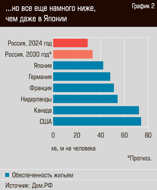Похоже, отчасти выводы были сделаны. Задача нового национального проекта «Инфраструктура для жизни» — ввести к 2030 году более 660 млн кв. м. Правда, нацпроект «Жилье», работавший в 2019–2024 годах, показал, что сами по себе объемы ввода не обеспечивают доступности жилья, тем более что наши девелоперы — частные компании и заставить их строить столько, сколько нужно, невозможно. Но в документ добавлена и другая задача: довести обеспеченность жильем до 33 кв. м на человека — и это все еще очень скромно по мировым меркам.