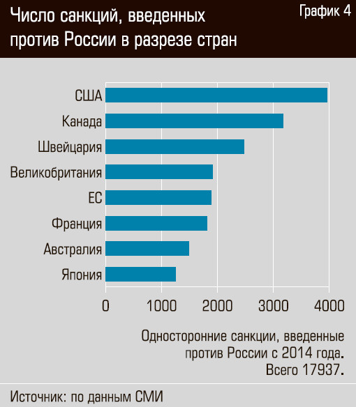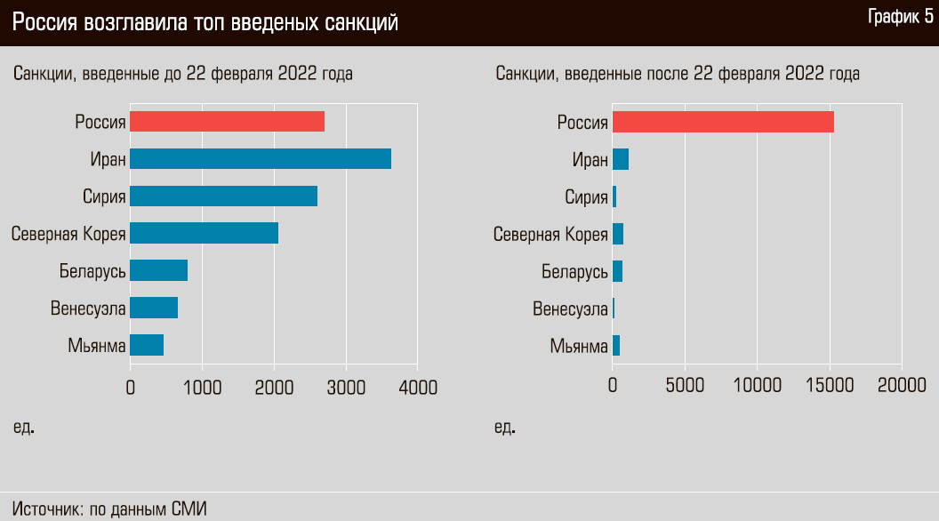 В момент введения санкций вряд ли кто-то мог подумать, что Россия, создающая 2–3% мирового ВВП, сможет эффективно противостоять экономикам G7, объединяющим более 43% мирового ВВП, и странам, к ним примкнувшим. Однако, несмотря на рекордное число санкций (см. графики 4, 5) и разрыв отношений с традиционными рынками в Европе, российские компании на удивление быстро адаптировались к давлению извне.