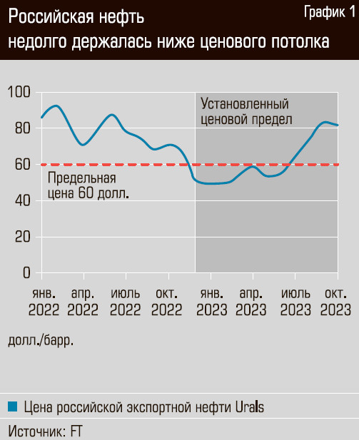 В ответ на введение ценового потолка президент России Владимир Путин подписал указ о специальных мерах. Документ запрещает продажу российских нефти и нефтепродуктов, если физлица и юрлица прописывают в контрактах потолок цен. Впрочем, для компаний из Индии и Китая сделали исключение и разрешили покупать российскую нефть по ценам ниже 60 долларов за баррель. Уровень ценового потолка на российскую нефть был преодолен несколько месяцев спустя после его введения — летом 2023 года. А уже в октябре практически не было ни одной партии российской нефти, отпущенной по цене ниже 60 долларов за баррель. Средняя цена Urals составила 80 долларов (см. график 1).