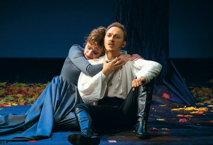 У «Повестей Пушкина» есть такой шанс. Шульев отказался только от одной из классического набора «Повестей покойного Ивана Петровича Белкина» и самой мрачной из всех — «Гробовщика». Все остальные на месте. Первая — «Барышня-крестьянка» — почти комедия положений. Художник-постановщик спектакля Максим Обрезков оформляет ее аскетичными образами: ключевой элемент сценографии — гигантские сосны. Но это только начало — вход в мир героев Пушкина. Здесь в центре внимания — актеры, а сценография