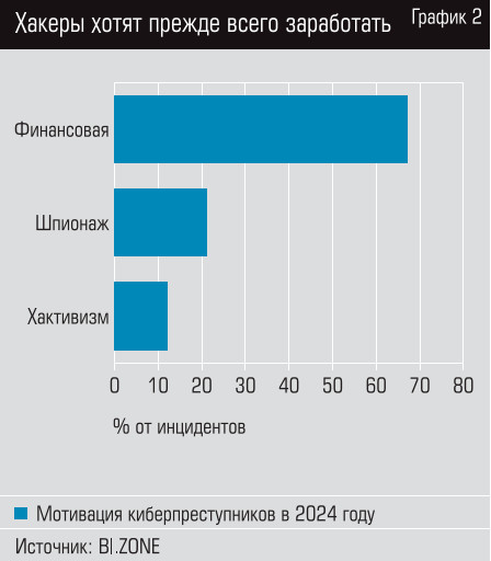 Что касается мотивов, то подавляющее число кибератак в корпоративном секторе РФ связано с финансовым интересом, то есть с желанием заработать: в 2024 году на долю таких преступлений пришлось 67% инцидентов, констатируют в BI.Zone. На втором месте — шпионаж (21%), а на третьем — «хактивизм» (12%): одиночные хакеры и группировки, которые встают на путь правонарушений по политическим и идейным соображениям (см. график 2).