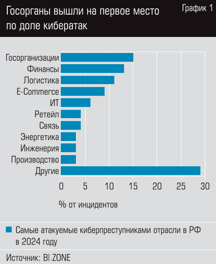 С ростом числа киберпреступлений меняются и цели злоумышленников. Согласно исследованию компании BI.Zone, в 2023 году чаще всего атаковали предприятия розничной торговли (ретейла) — 15% от всех инцидентов. В 2024-м же лидирует взлом систем государственных организаций (15%), а ретейл с показателем в 4% опустился на шестое место. Вторую строчку в списке самых желанных целей у хакеров, как и ранее, занимает финансовая отрасль: 13% в 2024 году (12% в 2023-м). Третью позицию удерживают транспорт и логистика: в 2024 году на эти сферы пришлось 11% кибератак (в 2023-м — 10%). Далее идут предприятия электронной коммерции (9%), информационных технологий (6%), упомянутой выше розничной торговли (4%), а также связь (4%), инженерные компании (3%), производство (3%) — см. график 1.