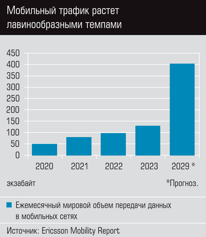 Более 100 тысяч участников из 205 стран собрались в этом году на главную телекоммуникационную выставку World Mobile Congress (WMC) — Всемирный конгресс мобильной связи в столице Каталонии. После пандемийного спада настроение в отрасли приподнятое: ключевые показатели развития услуг мобильной связи в мире заметно растут. По данным Ericsson Mobility Report, в декабре 2023 года ежемесячный мобильный трафик в мире достиг внушительных 130 экзабайт, это на 34% больше, чем в прошлом году, и в 2,6 раза превышает показатели 2020-го. А в ближайшие пять лет глобальный мобильный трафик предположительно вырастет еще в 3,3 раза, более чем до 400 экзабайт в месяц (см. график). При этом если в 2022 году на один смартфон приходилось в среднем 16 Гб использованного трафика в месяц, то в 2023-м уже 21 Гб, а к 2029 году этот показатель достигнет 56 Гб.