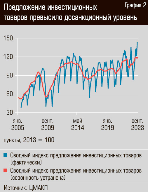Но налицо не только спрос на инвестиционные товары — с их предложением у нас тоже все весьма неплохо. Об этом можно судить по сводному индексу предложения инвестиционных товаров Центра макроэкономического анализа и краткосрочного прогнозирования (ЦМАКП). С динамикой этого индекса можно ознакомиться на графике 2. Как видим, после просадки в 2022 году, по всей видимости связанной с санкциями, уходом ряда иностранных компаний и выжидательной позицией некоторых российских компаний, предложение инвестиционных товаров в России превысило предыдущий рекорд конца 2021 года и если и замедляется, то снижаться пока точно не собирается.