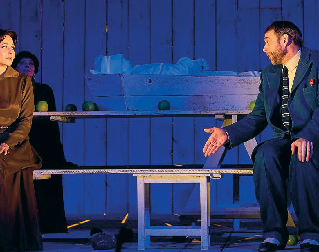 Во втором действия тональность спектакля меняется. В нем по-прежнему много смешного, но вместе с тем начинают звучать и трагические ноты. Как персонаж Симон остается на сцене. Он присутствует на ней словно незримо для всех остальных и комментирует собственные похороны. Его жена (ее играет Александра Ровенских) тем временем выясняет отношения с его любовницами: кому из