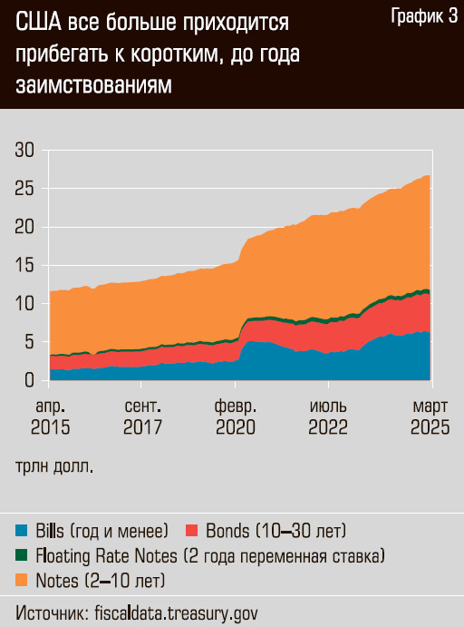 Основными инструментами заимствования являются Bills, казначейские векселя — очень короткие ценные бумаги, которые продаются с дисконтом к номиналу, а в конце срока держатель получает номинальную стоимость, Notes — казначейские ноты, которые имеют купонную доходность и чаще всего срок погашения в 2, 3 и 5 лет и Bonds — длинные ценные бумаги, аналогичные нашим долгосрочным ОФЗ. И доля сравнительно коротких бумаг растет все быстрее: за последние десять лет объем Bills вырос в четыре раза, тогда как Notes — менее чем в два раза (см. график 3).