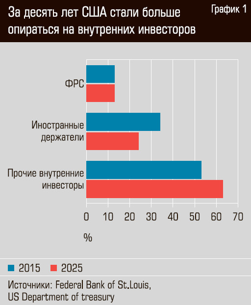 Если посмотреть, кто держит американский госдолг, можно увидеть, что три четверти его приходится на внутреннего инвестора (это патриотично, а главное, что может быть надежнее и ликвиднее американских ценных бумаг, по крайней мере с американской точки зрения?). На нерезидентов приходится примерно четверть (см. график 1). Среди крупнейших держателей на начало 2025 года все те же: Япония (1,07 трлн долларов), Китай (0,76 трлн) и Великобритания (0,74 трлн). Как видим, один из главных держателей — прямой торговый оппонент США.