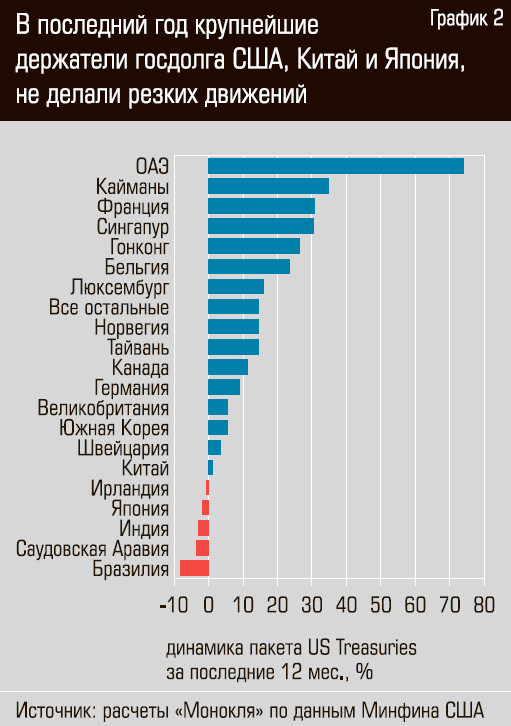 Стоит упомянуть, что десять лет назад во владении КНР американского госдолга было примерно на треть больше, чем сейчас. За десятилетие объем американского госдолга на руках иностранцев в процентном отношении даже несколько сократился. Теперь все ждут, когда КНР начнет использовать резкий и массивный сброс госдолга США как экономическое оружие, но пока этого не происходит. А вот слухи насчет распродажи этого долга японскими инвесторами и госструктурами появились. За последние десять лет доля Treasuries в японском портфеле сократилась незначительно (примерно на 8%), то есть они держали бумаги «до упора». Теперь вот могут слегка распродать портфель — проблем у Японии хватает и без пошлин.