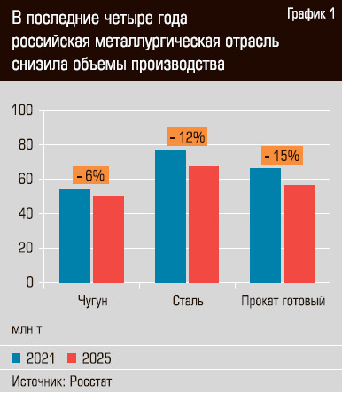 Минувший год для российских металлургов оказался сложным. Спад производства зафиксирован по большинству позиций товарной номенклатуры, а для ряда продуктов снижение выпуска достигло болезненных величин. В частности, выпуск легированной стали снизился за год на 15,5%, производство бесшовных стальных труб для нефте- и газопроводов — на 21,1%. С начала санкционного давления на Россию четыре года назад отрасль оказалась в значительной степени отрезана от премиальных западных рынков сбыта, с одной стороны, и зарубежных поставок оборудования, запчастей, сырья и материалов — с другой. По сравнению с последним довоенным 2021 годом производство стали в России снизилось на 11,8%, до 67,7 млн тонн, вернувшись к показателям начала прошлого десятилетия. Производство готового проката за четыре года снизилось еще сильнее — на 14,6%, до 56,7 млн тонн (см. график 1).