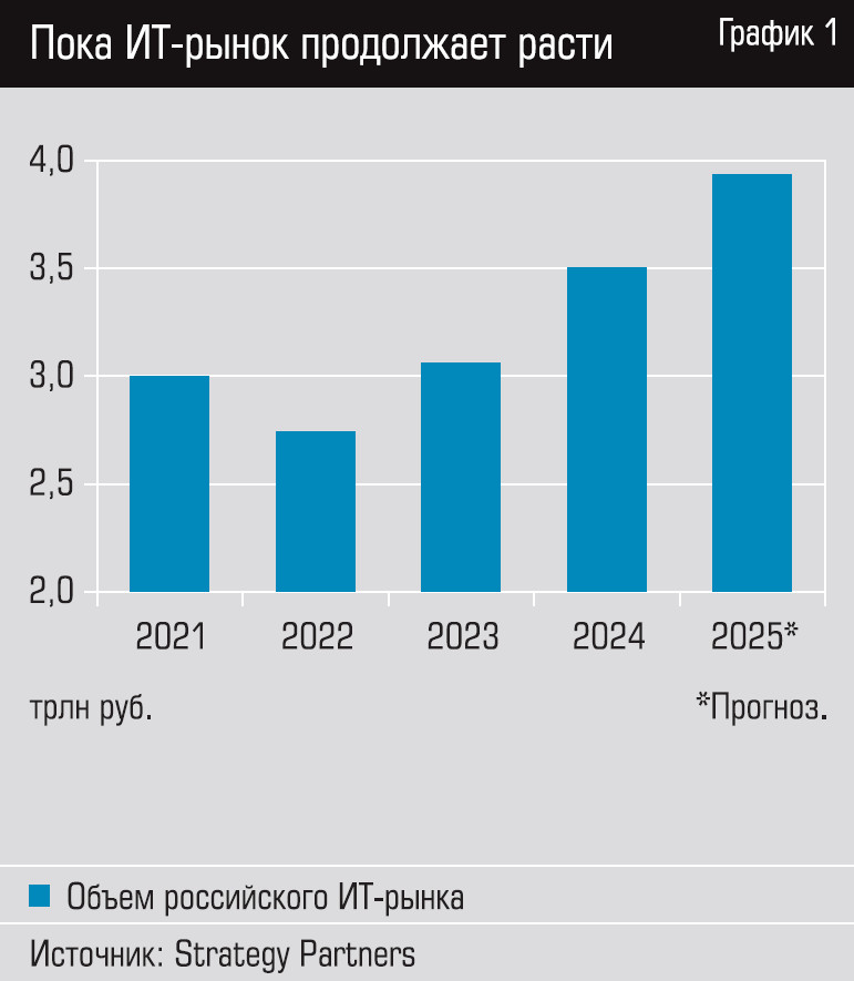 В целом последние три года российская ИТ-сфера динамично развивается. Да, сразу после начала СВО и ухода производителей из недружественных стран рынок существенно просел: по данным Strategy Partners, с отметки 3 трлн рублей в год он сократился до 2,74 трлн. Однако в 2023 и 2024 годах начался рост: по итогам прошлого года сектор расширился на 14%, до 3,5 трлн рублей. А в этом году ожидается, что рынок вырастет еще на 12%, достигнув 3,93 трлн (см. график 1).