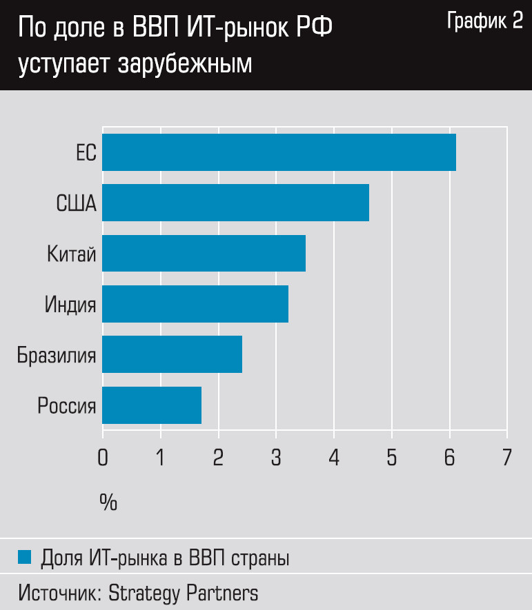 Аналитики указывают, что отечественная ИТ-отрасль имеет большой потенциал для роста. Хотя пока она сильно уступает странам — лидерам мировой индустрии как в абсолютных показателях, так и в доле от ВВП. В долларовом выражении в прошлом году ИТ-рынок достиг 37 млрд — это в полтора с лишним раза меньше, чем в Бразилии (52 млрд долларов), втрое меньше, чем в Индии (125 млрд), не говоря уже о Китае (648 млрд) и США (1,35 трлн). При этом, по данным Strategy Partners, доля ИТ-сферы в ВВП России оценивается в 1,7%, в то время как в Бразилии этот показатель равен 2,4%, в Индии — 3,2%, в Китае — 3,5%, в США — 4,6%, в ЕС — 6,1% (см. график 2).