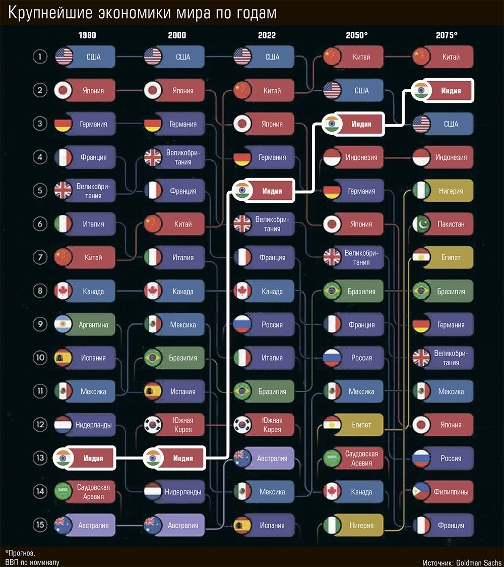 Если верить долгосрочным прогнозам Goldman Sachs, то определяющим фактором для развития экономики является не наличие ресурсов или технологий, а демографическая ситуация. Экстраполируя сегодняшние тренды в общепринятых границах государств, аналитики утверждают, что в конце этого века из G7 (семь экономик планеты, считавшихся крупнейшими в 1990-х годах, за исключением Китая) в топ-7 останется лишь одна — США. Место выбывших займут азиаты, прежде всего Китай, Индия и Индонезия.