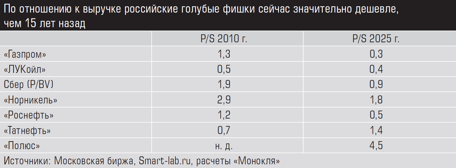 Капитализация наших ведущих эмитентов по отношению к их выручке серьезно снизилась за последние десятилетия. По данным сайта Smart-lab.ru, в 2007 году «Газпром» стоил 4,6 своей годовой выручки, а сейчас всего 0,3 годовой выручки. По остальным компаниям ситуация не лучше (см. таблицу). Такие низкие цены отражают полный упадок духа у инвесторов: они не верят, что бизнес эмитентов сколько-нибудь значимо вырастет. И причина тут далеко не только в геополитике. Так сложилось, что наш рынок акций всегда имел сырьевую ориентацию. Но сырьевые компании больше не «иксуют» — они не могут в разы нарастить свой бизнес и доходы. А представителей новых отраслей, которые способны на такой рост, на нашем рынке очень мало.