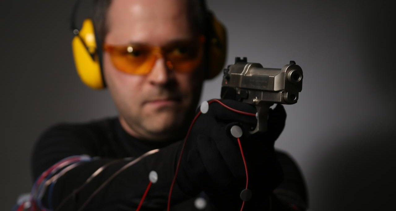 «Что такое миостимуляция? Если объяснять на пальцах, наши скелетные мышцы похожи на этот пистолет, — объясняет мне Климов. — В них запасена энергия в виде АТФ, которая до поры до времени дремлет, как и химическая энергия пороха внутри латунной гильзы. Но когда вы нажимаете на спусковой крючок, порох сгорает, и газы выталкивают пулю из ствола с энергией, на много порядков превосходящей энергию нажатия указательным пальцем. С мышцами так же: как только моторные нейроны подают очень слабый сигнал, мышцы начинают сокращаться за счет куда большей энергии гидролиза АТФ. Так вот миостимуляция — это как раз и есть то самое нажатие, служащее инициатором выстрела, — небольшой электрический импульс, который, будучи подведен к правильному месту, заставляет мышцу сокращаться».