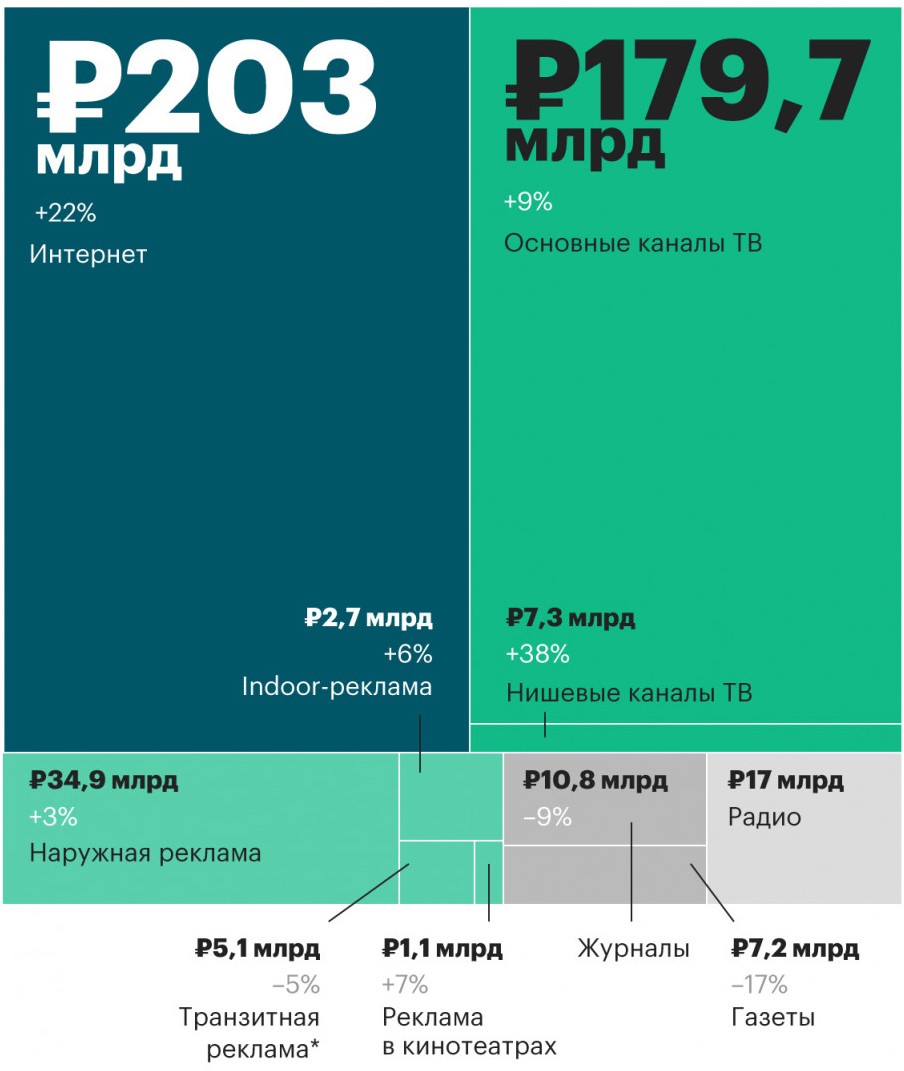 Как и в предыдущие годы, наилучшую динамику увеличения рекламных доходов — на 22%, до 203 млрд руб. — продемонстрировал сегмент интернета. Такая же динамика была и в прошлом году. Доходы сегмента ТВ в 2018 году показали более скромный рост — на 9%, до 187 млрд руб., против 13% по итогам 2017-го. Как отмечают эксперты АКАР, в 2018-м интернет впервые стал самым крупным в годовом выражении медиасегментом российского рекламного рынка, оттеснив на второе место телевидение. В отдельно взятом третьем квартале 2017-го интернет уже опережал ТВ-рекламу. Однако по итогам всего года телевидение вернуло себе лидерство: рекламные доходы вещателей составили 170,9 млрд руб., а интернет-площадок — 166,3 млрд руб.