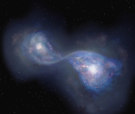 Явление, которое мы видим на фото, астрономы называют мерджингом. В принципе, мерджинг можно определить как вид взаимодействия галактик, приводящий к уменьшению их количества. Это понятие объединяет понятия слияния галактик и поглощения галактик. Мерджинги в основном классифицируются по разным критериям и, соответственно, бывают разные: малые и большие; двойные и множественные; мокрые, влажные, сухие и смешанные.