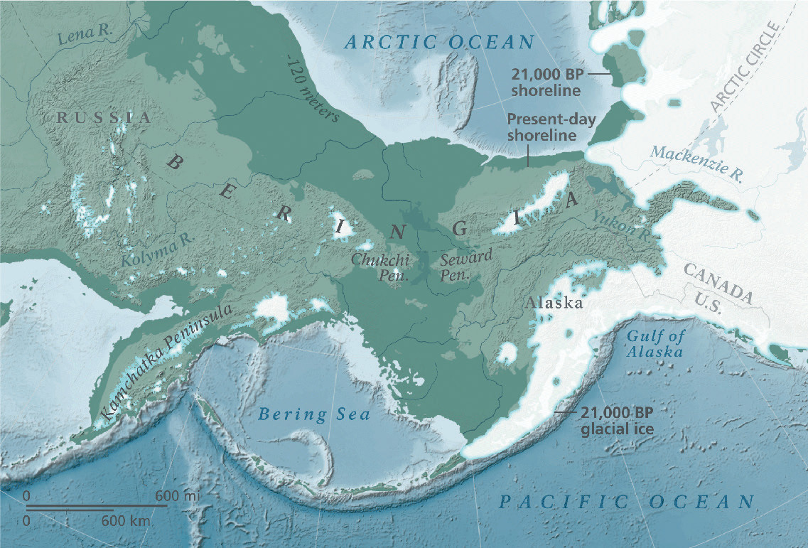 Отдельно стоит сказать несколько слов о том, где можно было в то время жить. Последнее большое оледенение закончилось около 12 тыс. лет назад. Именно вследствие случившегося тогда таяния ледника и затонула значительная часть Берингии, и не только она. Тогда же ушел под воду и Доггерленд, соединяющий с континентом Британию и многие другие земли. 13 тыс. лет назад, когда носители культуры кловис заселяли Америку, глобального потепления еще не случилось, и, с одной стороны, площадь суши, поднимающейся над уровнем Мирового океана была гораздо больше, но, с другой, значительная ее часть была занята ледником. Последний мог служить даже большим препятствием для передвижения, чем море.