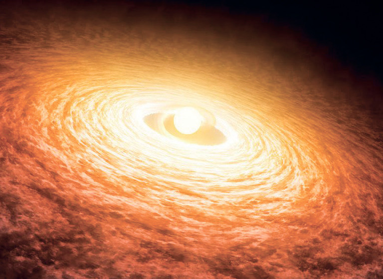 Начинать нужно с начала – с газопылевого диска, окружавшего рождающееся Солнце. Диск – это нечто плоское. В действительности, впрочем, плоским, как кольца Сатурна, он не был, а в сечении, скорее, напоминал сигару. И к тому же имел неодинаковую, возрастающую к внутреннему краю плотность. Неравномерно возрастающую, ибо по диску еще и проходила спиральная волна, аналогичная волне, образующейся на воде, уходящей в воронку. Вещество остаточного диска все еще поглощалось Солнцем.