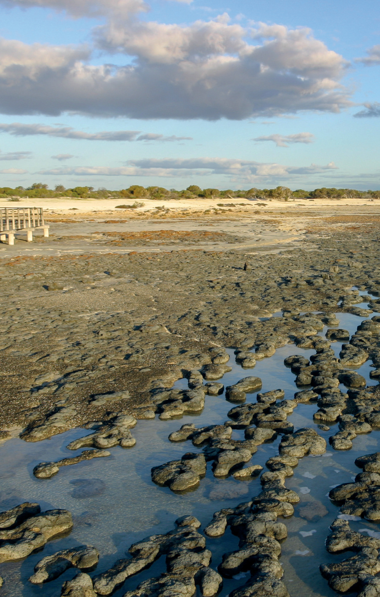 На западном побережье Австралии в стройные ряды выстроились массивные глыбы известковых «блинов». Здесь, в бассейне Хамелин Пул, мы встречаемся с удивительными живыми ископаемыми – современными строматолитами.