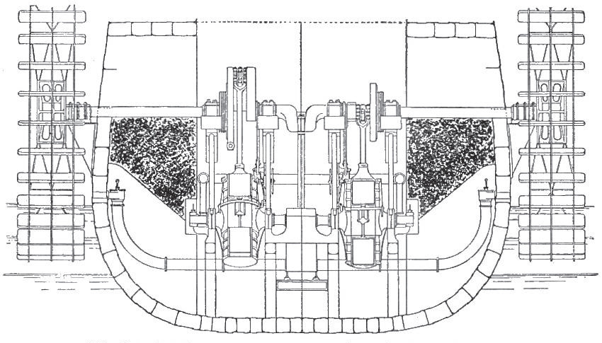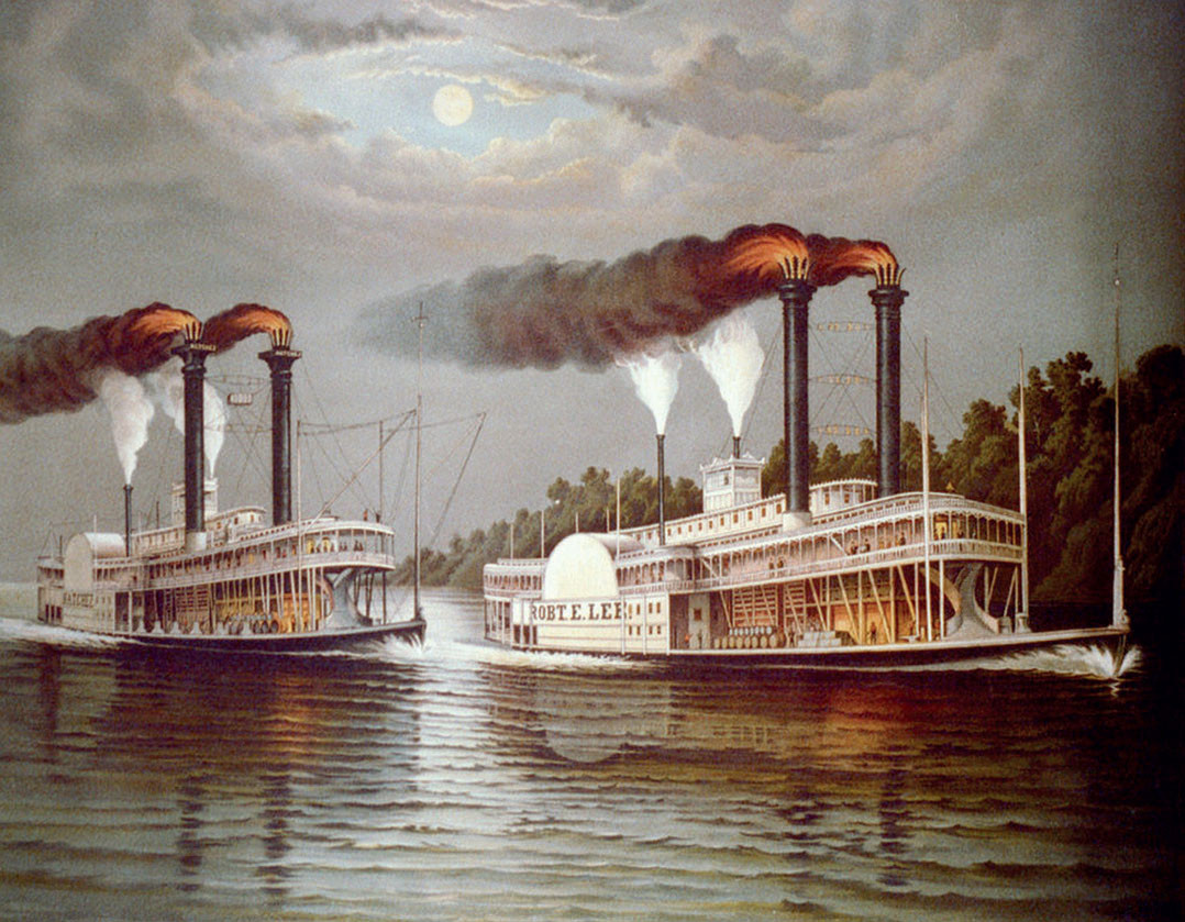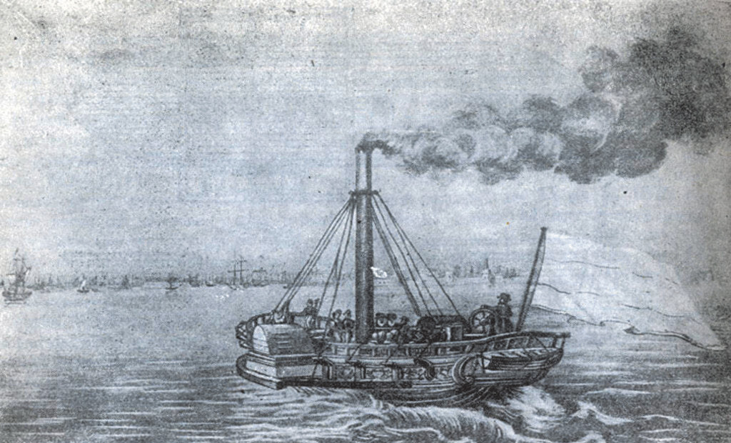 В 1707 году в Германии на реке Фульда появился первый в мире пароход, построенный французским ученым Дени Папеном. Он приводился в движение гребными колесами. И хотя испытания закончились взрывом котла, начало было положено. Первым же действительно работоспособным пароходом принято считать «Клермонт» Роберта Фултона с двумя гребными колесами диаметром 4,7 м с восемью лопастями шириной по 1,2 м. Детищем Фултона явился и первый в истории боевой пароход – пароходофрегат «Демологос», построенный в 1815 году. Интересно отметить, что это был катамаран, в промежутке между корпусами которого помещалось гребное колесо, защищенное таким образом от боевых и навигационных повреждений.