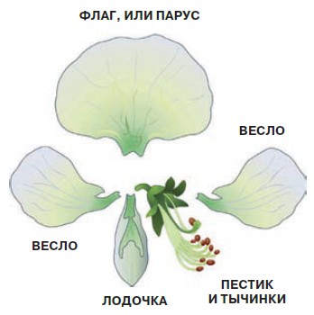 Цветки в длинных рыхлых кистях на концах побегов. Они довольно мелкие и слегка поникающие. Венчик типичного для Бобовых мотылькового типа, при котором лепестки чётко различаются по форме: верхний — самый крупный и слегка отогнутый — называется флагом, или парусом, более мелкие боковые — крыльями, или вёслами, а два нижних срослись, сформировав глубокую лодочку. Вся конструкция действительно напоминает одномачтовое парусное судно. В центре венчика — десять тычинок, нити девяти из них образуют трубочку, внутри которой находится один свободный пестик.