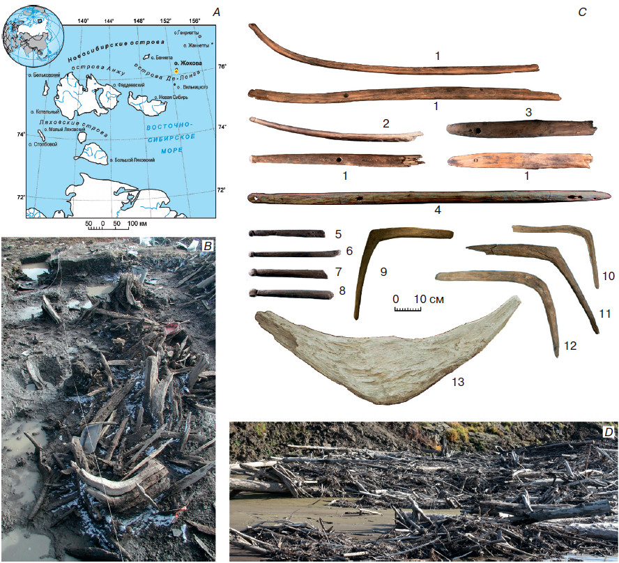 Жоховская стоянка на карте Новосибирских островов (А) и находки из неё: В — обломки дерева из культурного слоя; C — детали жоховских нарт: 1—4 — полозья; 5—8 — обломки деревянных стержней с выделенной «головкой»; 9—12 — копылья (вертикальные стойки); 13 — заготовка для изготовления копыла; D — завал плавниковой древесины. Сводное изображение из статьи: Питулько В. В., Павлова Е. Ю. // Stratum Plus, 2025.