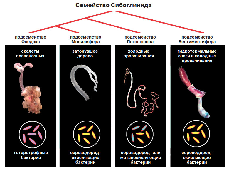 Сульфатредуцирующие бактерии, обитающие в толще осадка, используют сульфаты для анаэробного (то есть протекающего в отсутствие свободного кислорода) окисления метана. Продукт этой реакции — сероводород, который проникает в организм сибоглинид. Мы помним, что трубки погонофор открыты на заднем конце, а у вестиментифер, обитающих в районах холодных просачиваний, погружённые в осадок участки трубок имеют тонкие пористые стенки, проницаемые для сероводорода.