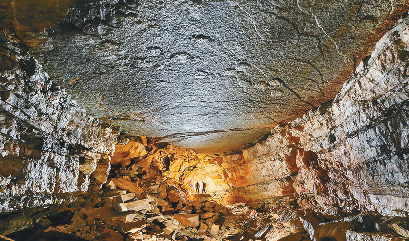 В одной из самых глубоких и разветвлённых карстовых пещер мира (юг Франции, департамент Лозер) группа любителей-спелеологов под руководством профессионального палеонтолога Жана-Давида Моро нашла следы огромного динозавра. Хотя в этом участке пещеры ежегодно бывают тысячи экскурсантов, до сих пор никто этих следов не замечал. Дело в том, что они расположены на потолке подземного зала размерами 20 на 80 м и высотой 10 м (см. фото вверху), а на потолок редко кто смотрел. Но находка не означает, что ящеры в самом деле бегали по потолку. Около 200 миллионов лет назад, в юрском периоде, потолок нынешней пещеры был песчаным берегом моря. Море трижды заливало берег, откладывая новые слои ила, песка и глины и снова уходя на два-три десятка миллионов лет. В один из сухих периодов по пляжу прошёл растительноядный динозавр длиной, судя по размерам следов, более 30 м. Затем, 145 миллионов лет назад, море окончательно отступило, оставив три слоя отложений. Следы прогулки были на самом нижнем слое. Миллионы лет подземные воды размывали этот слой, его часть обвалилась, образовав пещеру, и вышло так, что следы, их нижняя, выпуклая сторона, пришлись на потолок пещеры.
