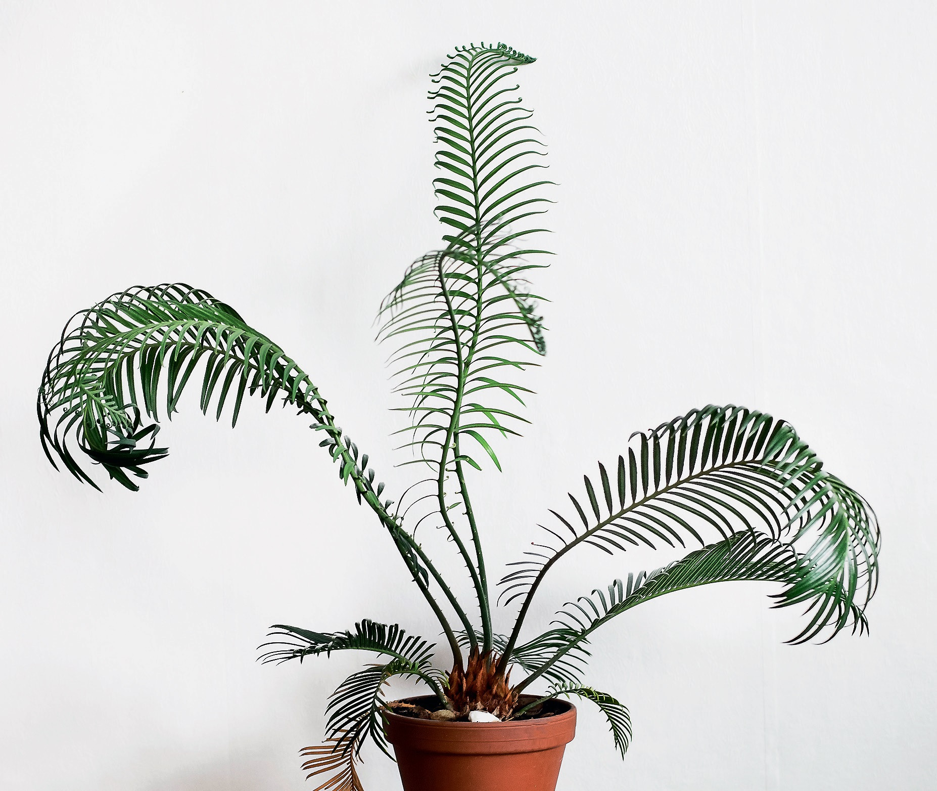 Пошли в рост и первые листья! Но у одного из трёх, самого маленького, лист не раскрылся, у второго — замер и начал засыхать по краям. Лишь один саговник я посадила в почву, он был самый крепкий, и мне казалось, что уж ему-то хватит сил на долгую жизнь... Я любовалась им! Расширенное основание выглядело как луковица с толстыми, мясистыми, заострёнными на верхушках чешуями. Листочков оказалась пара — перистые, плотные. На первых порах развития они свёрнуты в виде улиток, затем постепенно раскручиваются. Так, из трёх саговников у меня укоренился и пошёл в рост только один. Но я считала, что эксперимент удался.