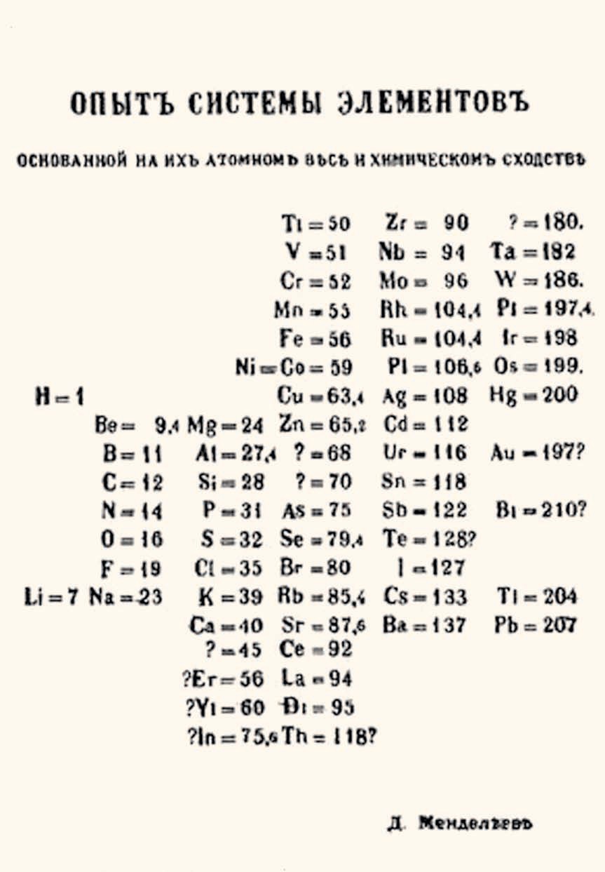 История не даёт однозначного ответа на ряд вопросов, связанных с окончанием работы над первой версией Периодической таблицы. Известно, что в понедельник, 17 февраля 1869 года, Менделеев завершил разработку рукописной версии таблицы «Опыт системы элементов, основанной на их атомном весе и химическом сходстве». Необходимая дополнительная информация содержалась в статье, которая была написана в последней декаде февраля и опубликована также в 1869 году в «Журнале Русского химического общества».