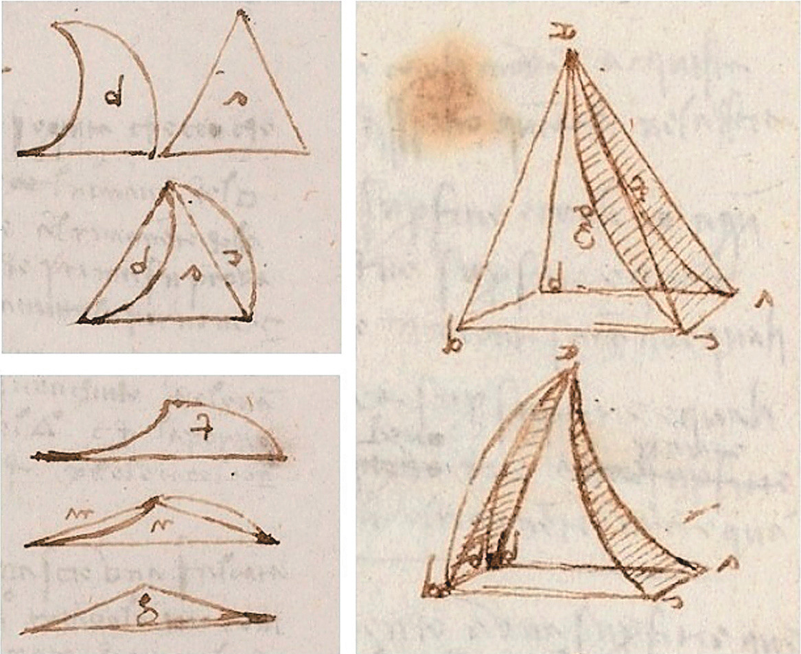 А вот Леонардо пошёл дальше и приспособил этот приём к криволинейным фигурам. Вот простой, но показательный пример. Обычный треугольник он преобразует в криволинейный, отрезая с одной стороны фигуры сегмент и приставляя его к другой стороне. Как решить задачу технически — это уже другой вопрос, тут важна сама идея. Ничто не мешает проделать то же самое с квадратом. И вот уже среди рисунков мастера появляются... криволинейные «пифагоровы штаны», этакое обобщение знаменитой теоремы в стиле да Винчи. Серия эскизов позволяет даже проследить их «эволюцию». Точно так же, перейдя от плоских фигур к объёмным, он будет пробовать перекроить многогранники. Да, геометрия Леонардо — во многом эмпирическая наука, а сам он в первую очередь практик и экспериментатор; зачастую поиск решения и конечный результат занимают его больше всего.