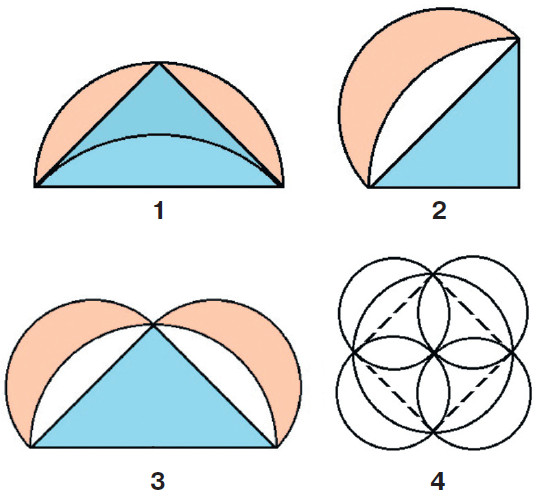 Леонардо экспериментировал с самой простой луночкой, у которой внешний обвод — полуокружность, а внутренний — четверть окружности. Её можно получить так: вписать в полукруг равнобедренный треугольник и внутри него на гипотенузе построить сегмент, подобный сегментам, отсекаемым катетами. Другой способ построения ещё проще. Нужно взять четверть круга и вне его на хорде, соединяющей концы радиусов, описать как на диаметре полуокружность. Нетрудно убедиться, что в обоих случаях луночка и треугольник равновелики. Гиппократу приписывают доказательство теоремы: сумма площадей двух луночек, примыкающих к катетам равнобедренного прямоугольного треугольника, равна площади этого треугольника. Интересно, что в конце XIX века один историк математики увязал происхождение квадратуры этой луночки с распространённым орнаментом из пяти пересекающихся кругов. В этом узоре четыре внешние луночки равновелики квадрату, вписанному в большой круг. Такую же и подобные ей конфигурации детально изучал и Леонардо-геометр.
