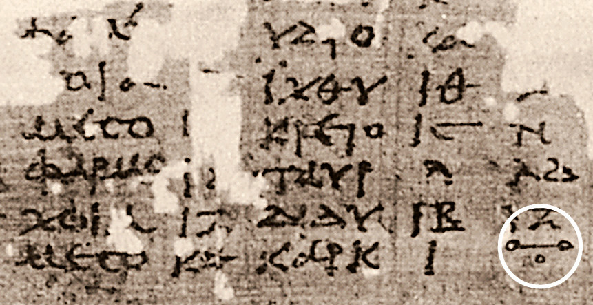Черта сверху, которая обозначает цифру, здесь гораздо длиннее кружка и, в свою очередь, оканчивается кружками... Впрочем, альтернативного объяснения появления в символе именно кружка эти исследователи дать не могут. Есть любопытная гипотеза, что форма нуля связана со счётом с помощью камешков на доске, посыпанной песком или пылью, которую называли абаком. Когда означавший цифру камешек убирали, на его месте оставалась ямка, похожая на букву «ο». Так это или иначе, но птолемеевское написание нуля, возможно, сыграло свою роль в обретении им современной формы.