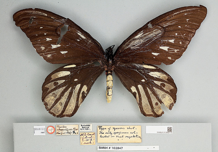 - Одна из самых больших бабочек мира, птицекрылка королевы Александры, встречается только на востоке Новой Гвинеи. Размах крыльев крупной самки до 28—30 см. На снимке экземпляр из Британского музея естественной истории.