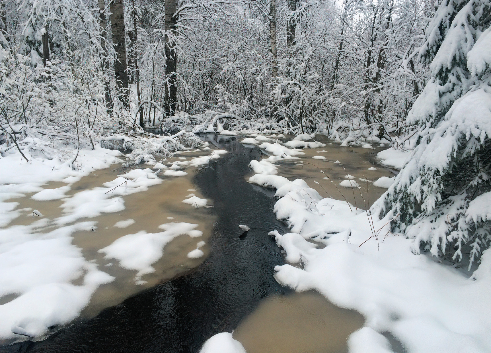 Пробираясь дальше по еле заметным звериным тропам, я понимаю, что они куда-то обязательно выведут. Так обыкновенно и происходит. Чаще всего эти маршрутные ниточки заканчиваются водопоем. Многочисленные лесные озерца и лужи сейчас ещё подо льдом, только оттепели вскрывают их травянистые края, а вот роднички, дающие начало небольшим речкам, питают наших лесных соседей свежей водичкой.