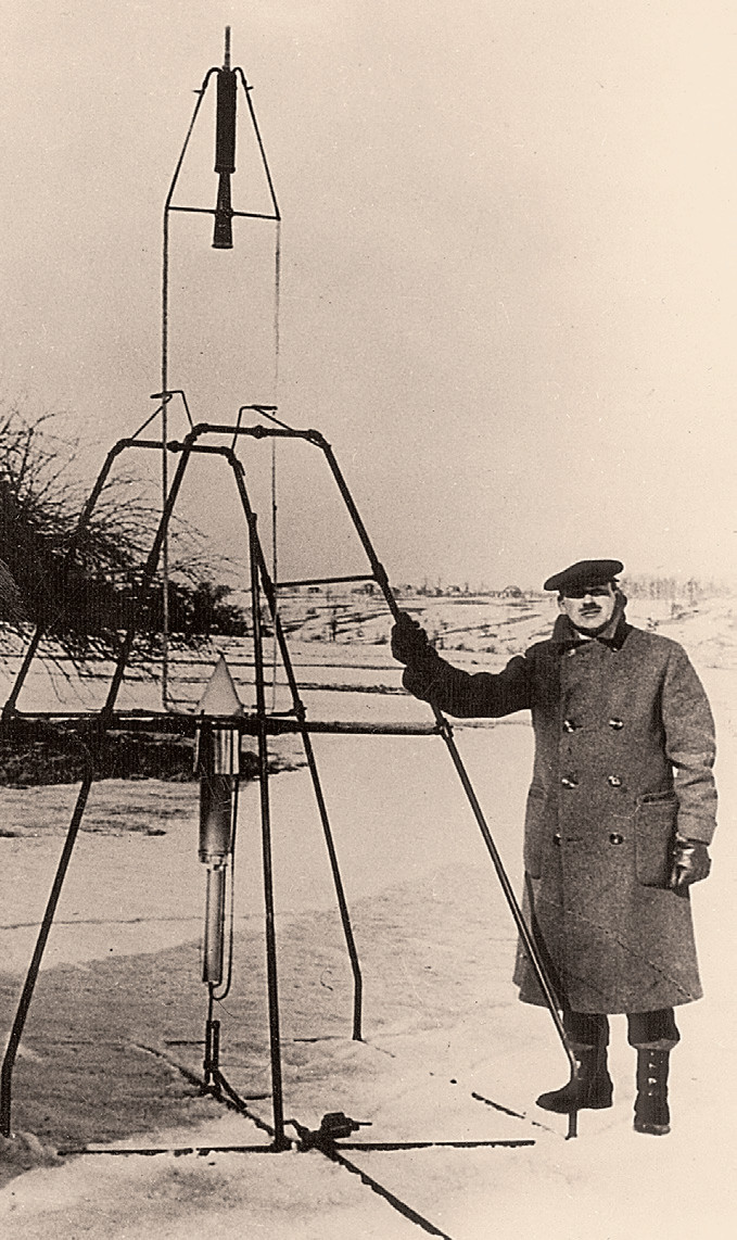 На снимке Годдард с пусковой установкой, в которую заправлена ракета на бензине и жидком кислороде.