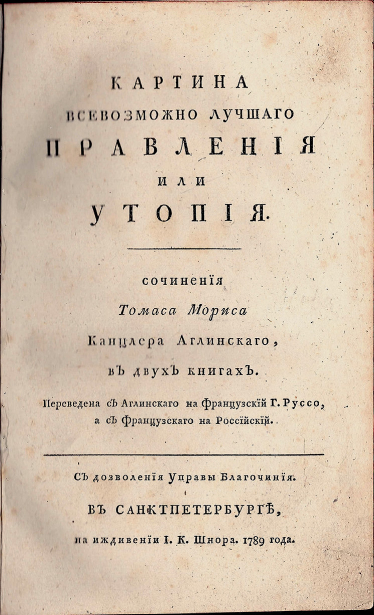 В России не было столь авторитетного и популярного источника, как «Утопия» Томаса Мора. Более того, тираж первого перевода этой книги на русский язык с французского под названием «Картина всевозможно лучшаго правления или Утопия. Сочинения Томаса Мориса Канцлера Аглинскаго, в двух книгах», напечатанный в 1789 году, был немедленно сожжён по приказу императрицы Екатерины II, которая уже в самом названии увидела угрозу самодержавной власти. Издателю пришлось подготовить новую версию, которая была опубликована через год под более нейтральным заголовком: «Философа Рафаила Гитлоде странствование в Новом Свете и описание любопытства достойных примечаний и благоразумных установлений жизни миролюбиваго народа острова Утопии. Сочинение Тома Мориса». Однако и в этом виде книга долгое время оставалась единственным полным изданием сочинения Мора на русском языке: следующее появилось в 1901 году, а прямой перевод с латыни был издан только в 1937 году.
