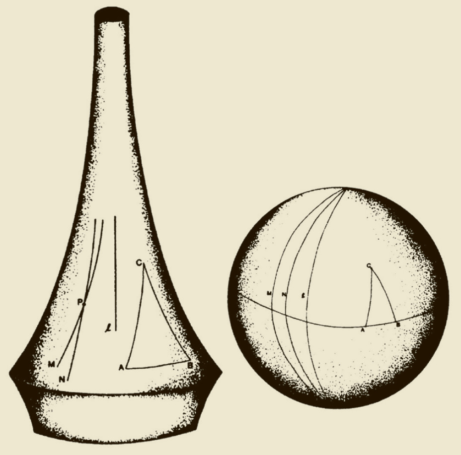 До XIX века вся геометрия опиралась на принципы и постулаты, изложенные в сочинениях древнегреческого мыслителя Евклида. В 1824 году немецкий математик и астроном Карл Гаусс пришёл к выводу, что возможна и «неевклидова» геометрия, но не решился рассказать о своём умозаключении коллегам. Поэтому авторство её открытия принадлежит нашему соотечественнику — Николаю Ивановичу Лобачевскому, который в 1826 году разработал «воображаемую» геометрию. Пятый постулат Евклида в известной нам со школы формулировке гласит: «В плоскости через точку, не лежащую на данной прямой, можно провести одну и только одну прямую, параллельную данной». Лобачевский предложил свой вариант: «На плоскости через точку, не лежащую на данной прямой, проходит более чем одна прямая, не пересекающая данную». Получалось, что в неевклидовой геометрии через точку может быть проведено бесконечное количество прямых, параллельных любой произвольной, а сумма углов треугольника в таком случае становится меньше 180°.