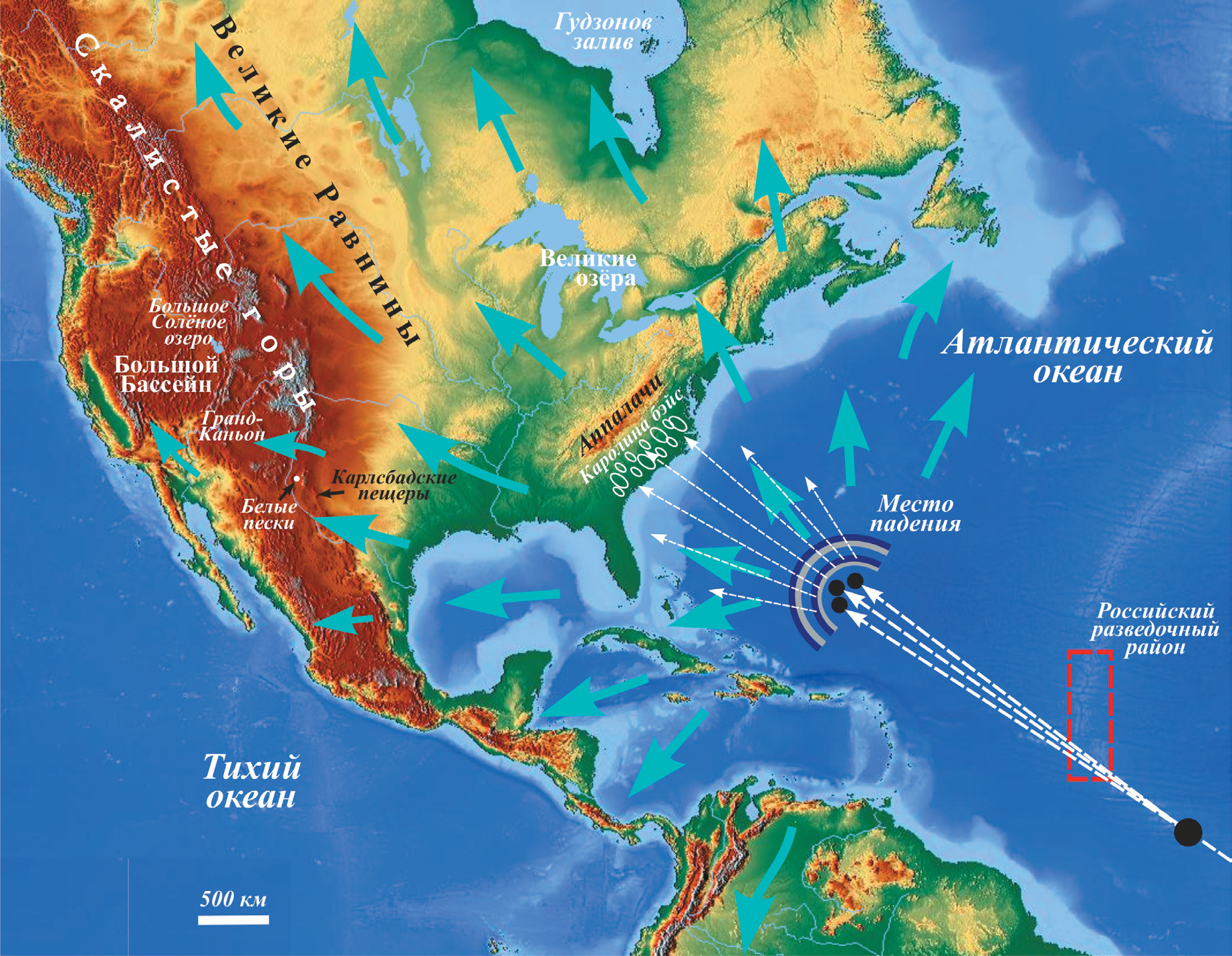 Исследователи из Института дистанционного прогноза руд (ИДПР), Геофизической обсерватории «Борок» — филиала Института физики Земли РАН им. О. Ю. Шмидта (ГО «Борок» ИФЗ РАН) и Полярной морской геологоразведочной экспедиции «Росгеология», в числе которых — авторы настоящей статьи, провели свои изыскательские работы, по результатам которых высказали предположение, что обсуждаемое ударное событие произошло в северной части Атлантического океана в районе Бермудского треугольника. Отличительная особенность этого столкновения — очень пологая траектория полёта астероида по отношению к поверхности Земли, вследствие которой длительный полёт в плотных слоях атмосферы привёл к его значительному аэродинамическому разрушению, и перед падением в океан астероид представлял собой не единый ударник, а рой разнокалиберных обломков. Именно поэтому падение не привело к образованию ударного кратера (вследствие чего его до сих пор и не нашли), но зато оставило много других специфических следов, характерных для столкновений с Землёй крупных космических объектов. При этом специфика предполагаемого места падения (Мировой океан) и предложенное направление полёта астероида (с юго-востока на северо-запад), противоположное направлению, указанному авторами YDIH-гипотезы, позволяют нарисовать несколько иной сценарий столкновения и последовавших за ним событий.