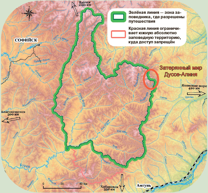 Восточная граница заповедника очерчена хребтом Дуссе-Алинь. Это с его западных склонов и стекают истоки большой реки. На мелкомасштабных картах название Дуссе-Алинь вы не найдёте. Возможно, это следствие научной ошибки, а, может, просто из-за нехватки места. Во всяком случае, пустой промежуток между надписями Буреинский хребет и хребет Ям-Алинь как раз и занят нашим «невидимкой». А научная ошибка была совершена Александром Миддендорфом. Он нашёл это название на старых китайских картах, но не знал куда пристроить, так как полагал, что водораздел между реками Амгунь и Бурея состоит из одновременного по происхождению хребта. Экспедиция АН СССР 1934 года восстановила справедливость, признав, что северная часть Буреинского хребта от истоков реки Ургал соответствует другой по времени фазе складчатости: «… для внесения большей ясности в тектонику края мы считаем целесообразным оставить старое название “Дуссе-Алинь”, закрепив название “Буреинский”, предложенное акад. Миддендорфом, за южной частью хребта».