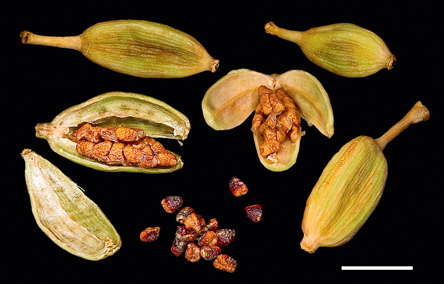 На небольших частных плантациях плоды сушат на солнце, вследствие чего они приобретают светло-желтоватую окраску, хотя больше ценятся коробочки зелёного цвета, которые высушиваются под навесами. Белые коробочки получаются после обработки их для лучшей сохранности сернистым ангидридом. В крупных хозяйствах кардамон сушат в современных сушильных шкафах. Зелёный кардамон благоухает гораздо сильнее, зато у светло-жёлтых и белых в запахе более выражена сладкая нотка и смягчён жгучий вкус. Зелёный кардамон популярен на Востоке, а светлый — в Европе.