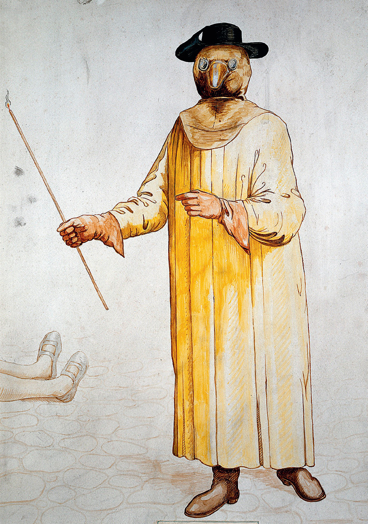 Ещё Плиний Старший (24—79 гг.) рекомендовал шахтёрам, разрабатывавшим свинцовую руду, носить для защиты от её ядовитой пыли примитивные маски. Поступать так же во время пыльных ураганов советовал Леонардо да Винчи (1452—1519). Но, как пишет французский журнал «Le Point», первым медицинскую маску предложил носить во время эпидемий Шарль де Лорм, личный врач трёх французских королей, от Анри IV до Людовика XIV. Идея возникла у него во время эпидемии чумы 1619 года, сократившей население Парижа чуть ли не в десять раз. Врачи в таких масках ухаживали за больными, помогали хоронить умерших и проводили вскрытия с целью описать посмертные изменения в организме погибших. Длинный загнутый нос маски из картона, прокипячённого в воде (получался материал, из которого и в ХХ веке ещё делали фибровые чемоданы), набивали ароматическими травами, мятой, лепестками розы, камфарой и амброй. Считалось, что от больных заражаются через миазмы, то есть ядовитые испарения, а приятно пахнущие вещества их нейтрализуют. Остальные детали костюма также имели защитные функции. Ткань платья пропитывали воском или жиром, что делало её воздухонепроницаемой для защиты от тех же испарений-миазмов. Трость в руках врача служила для осмотра умирающих или уже умерших, ею лекарь мог отстранять детали одежды, мешающие видеть кожу больного. Кроме того, она позволяла отбиваться от толпы, которая часто видела в докторах намеренных распространителей болезни. Широкополая шляпа дополнительно защищала лицо от заразы и ясно говорила о профессии её носителя. Возможно, именно своему костюму де Лорм обязан тем, что прожил 94 года — значительно дольше средней продолжительности жизни в то время, хотя он работал на чумных эпидемиях не только в Париже, но и в Риме, и в Неаполе.