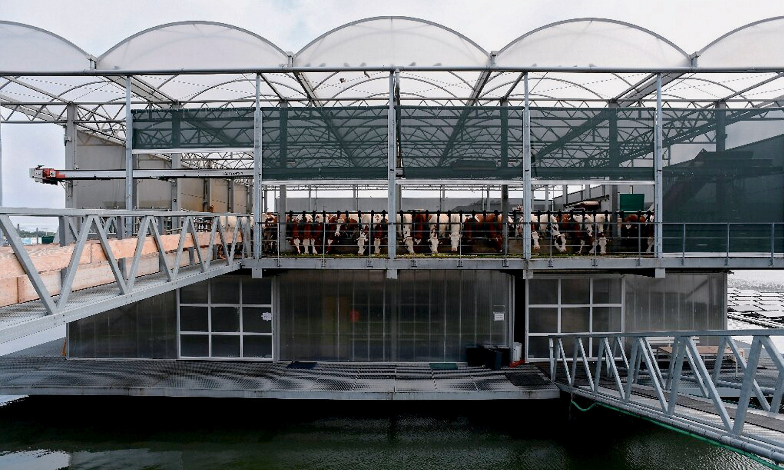 А пока животноводство Нидерландов, кажется, нашло новый выход. Это морские фермы. Поголовье скота размещают на огромных баржах или понтонах, фактически плавучих островах. Один такой действует с 2019 года в порту Роттердама. Остров состоит из трёх этажей общей площадью 930 м2: на верхнем живут 40 бурёнок голландско-немецкой породы, и этот этаж накрыт солнечными панелями, поставляющими ферме энергию. Выход молока — более 750 литров в день, коров доят роботы. Человеческий персонал острова — 14 сотрудников. На среднем этаже молоко, поступившее с верхнего, превращают в масло, йогурт и сыр, а ниже ватерлинии, в полумраке, созревают до 1000 головок сыра трёх-четырёх сортов. Продаются эти продукты несколько дороже «сухопутных». Ещё один ценный побочный продукт — навоз, его перерабатывают в удобрение, сухие и ничем не пахнущие гранулы. Их охотно покупают местные футбольные стадионы, которым постоянно надо поддерживать газон в рабочем состоянии.